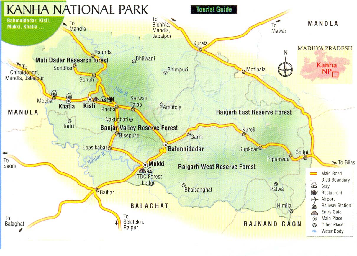 Located in the Mandla district of Madhya Pradesh, 160 Km s from Jabalpur, Kanha national park cum Tiger reserve extends over an area of over 1,940 Sq. km’s of which 940 Sq. Km’s is designated core area and the rest buffer. The major feature of this region's interesting topography is the horseshoe shape valley and the whole park area is surrounded by the spurs of the Mekal. The Surpan River meanders through Kanha's central Maidans, grasslands that cover the extensive plateau. Kanha National Park offers home to rare hard ground barasingha.