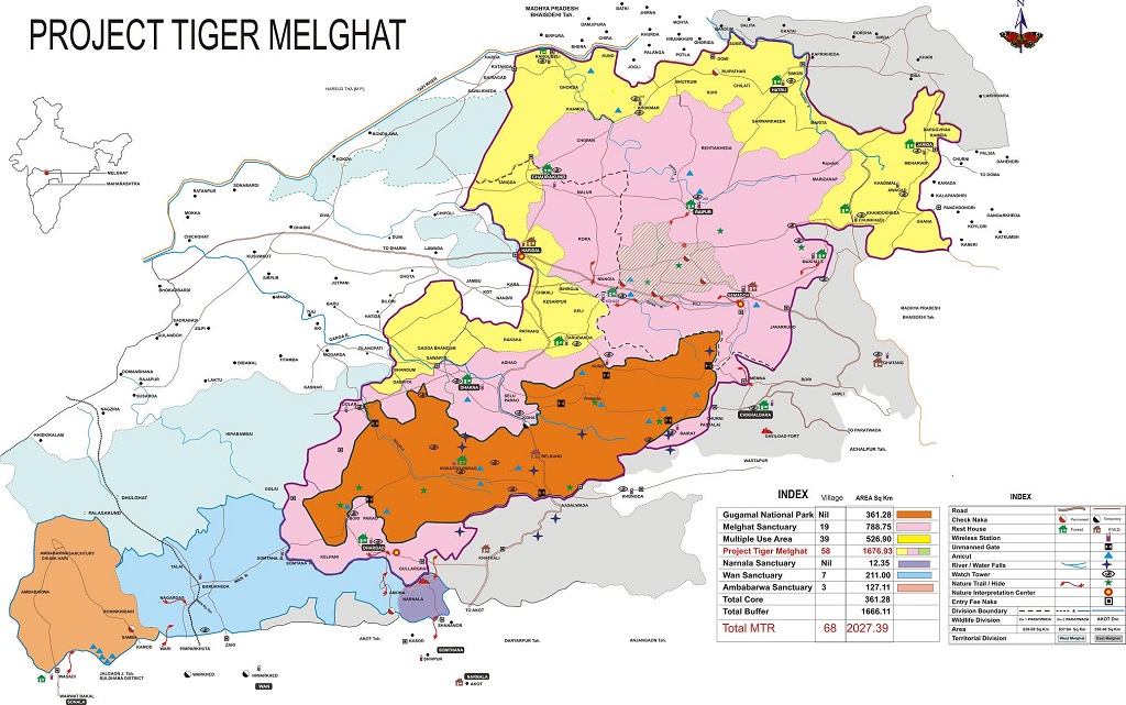 Situated in the Satpura hill ranges of Central India, Melghat Tiger Reserve lies in Melghat Forests of Amravati district in Vidarbha region of Maharashtra bordering Madhya Pradesh in the North and East. Its area is geographically located as given below.